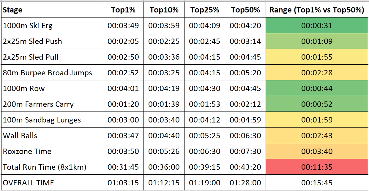Practice your transitions. Walking from the run to each station, catching your breath, and mentally preparing for the next challenge can save precious minutes.